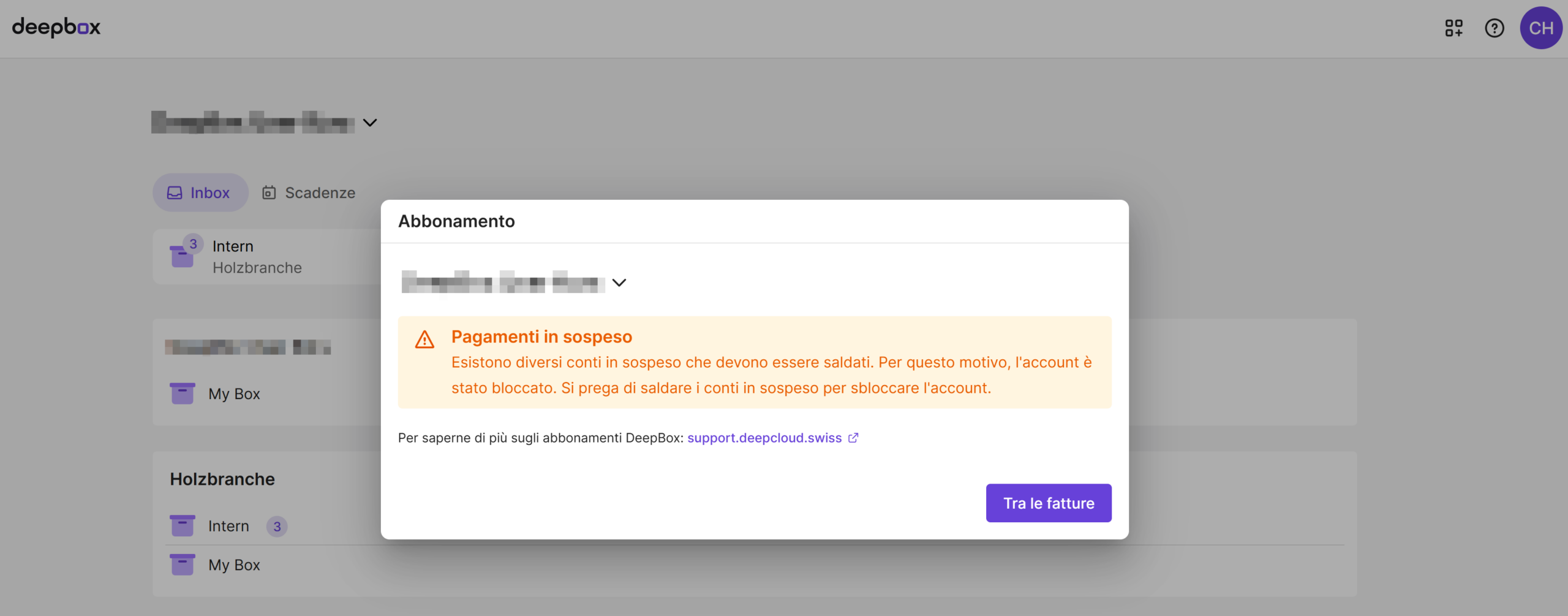Se tre o più fatture non sono state pagate, i prodotti del tuo account rimarranno bloccati fino al pagamento degli importi non pagati. Questo vale sia per DeepBox che per DeepSign.