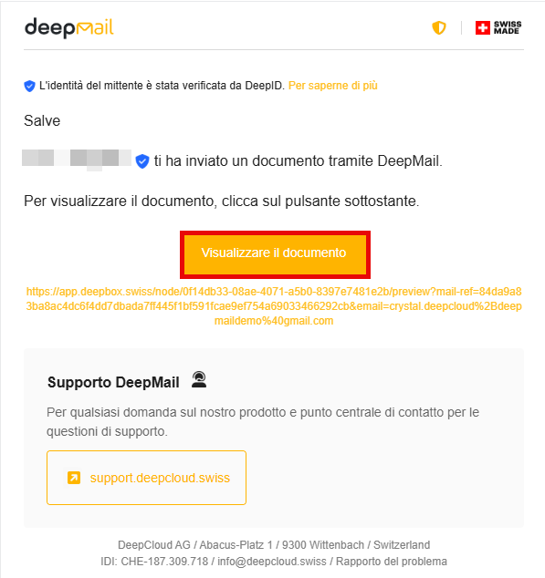Quando vengono inviati documenti tramite DeepMail (ad esempio, da Abacus), i destinatari ricevono una notifica via email della nuova consegna. Con il pulsante presente in questa e-mail, possono scaricare il documento e avviare il processo di registrazione.
