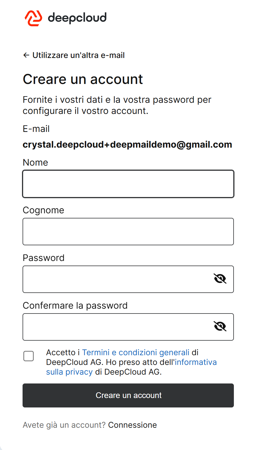 Per creare un account, è necessario solo definire il nome, il cognome e una password sicura e accettare i termini e le condizioni.