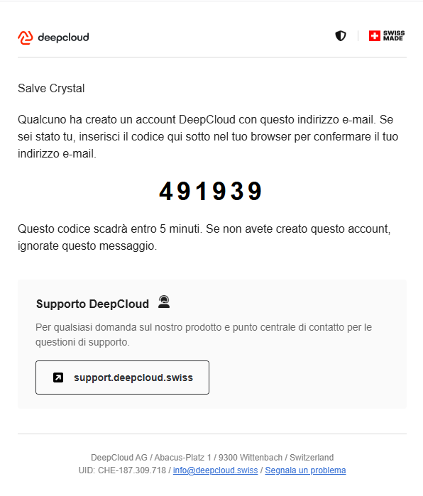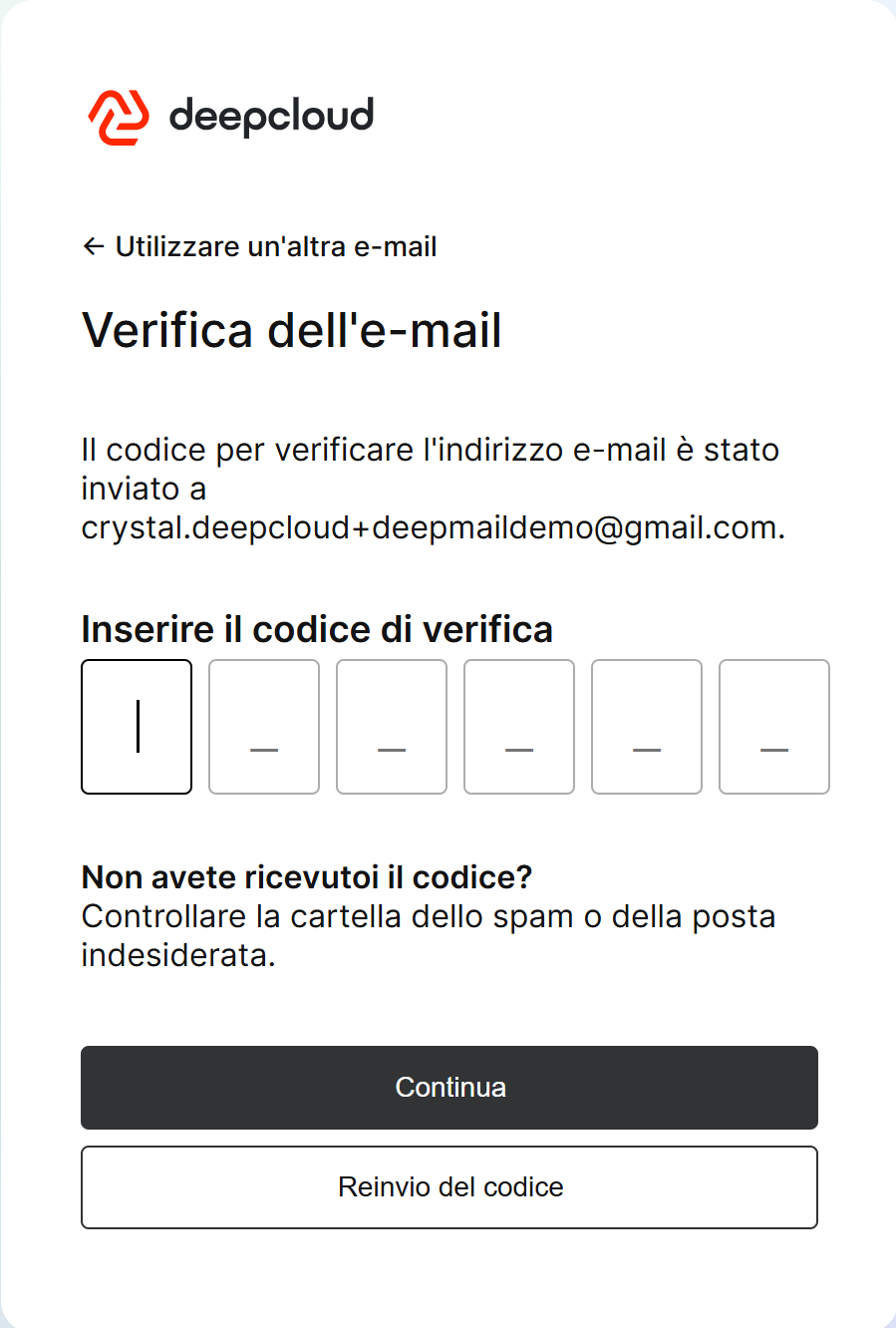 Successivamente, viene inviato un codice di 6 cifre all’indirizzo e-mail indicato. Inserire il codice per verificare l’indirizzo e-mail.